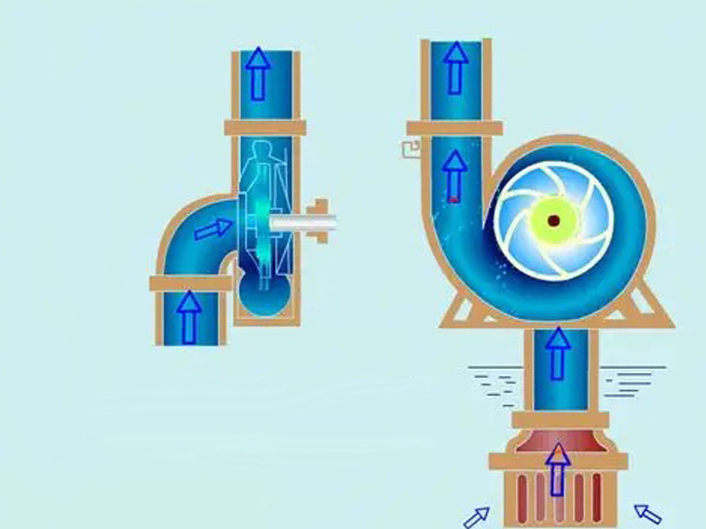 2. การหมุนของใบพัดทำให้เกิดแรงเหวี่ยงหนีศูนย์กลาง ทำให้ของเหลวเคลื่อนที่จากจุดศูนย์กลางของใบพัดไปยังขอบด้านนอกตามช่องทางของใบพัด
