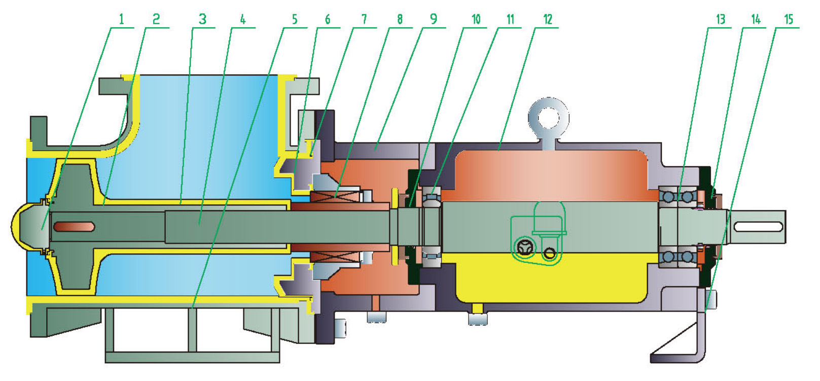 | ① น็อตใบพัด | ฟลูออโรพลาสติกบุเหล็ก/ PFA | ⑥ ฝาครอบปั๊ม | ฟลูออโรพลาสติกบุเหล็ก/ PFA | ⑪ ตลับลูกปืนหน้า | จีซีอาร์15 |