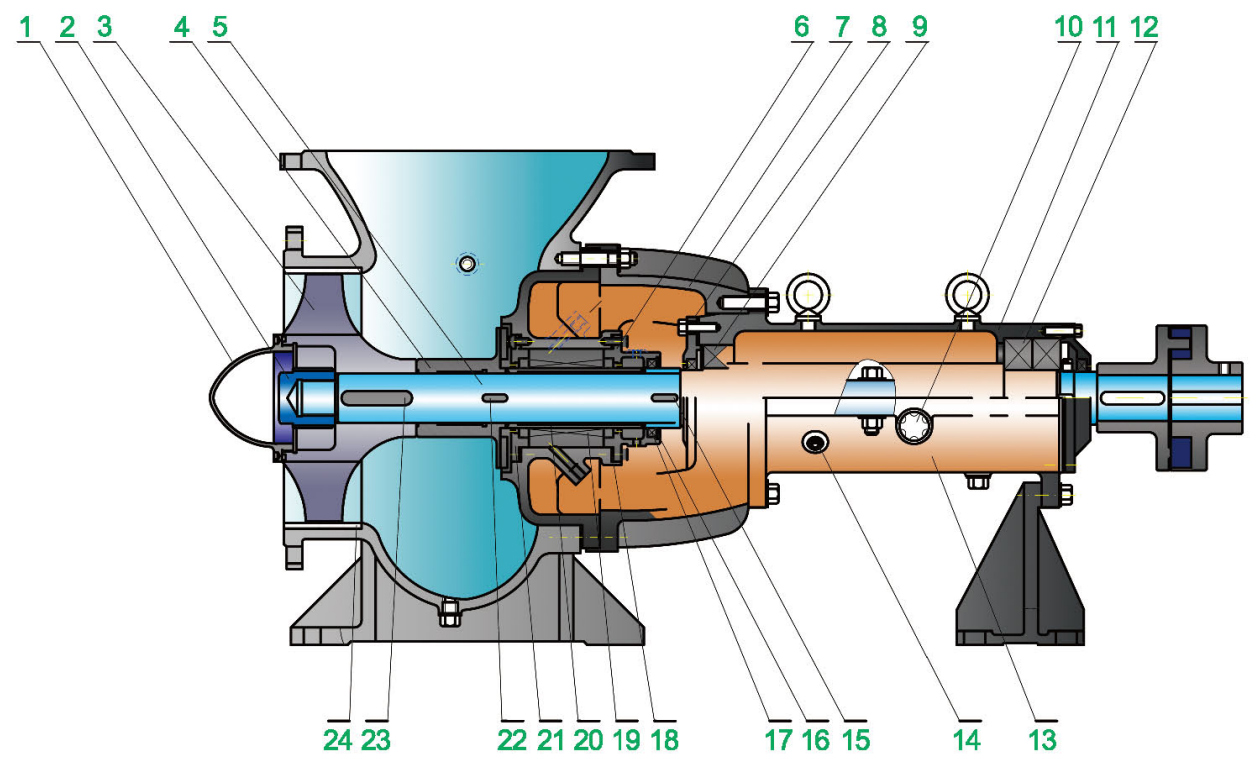| ⑤ เพลาปั๊ม | 2Cr13 | ⑬ฝาครอบกล่องลูกปืนด้านล่าง | เอชที200 | ㉑สายฟ้า | 304/316/316L |