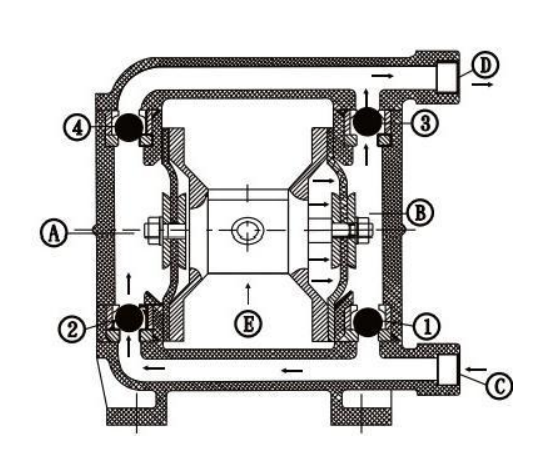 2. เมื่อส่วน A ขยายตัว ของเหลวจะถูกดูดเข้าทางช่องรับ ③ เมื่อของเหลวเข้าสู่ส่วน ④ วาล์วบอล ② จะเปิด และวาล์ว ④ จะปิด