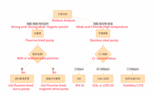 **อุณหภูมิสูงและความเข้มข้นสูง**: นิยมใช้ปั๊มขับเคลื่อนด้วยแม่เหล็กที่ทำจากสแตนเลสอัลลอยด์สูง (เช่น 316L) หรือฟลูออโรพลาสติก